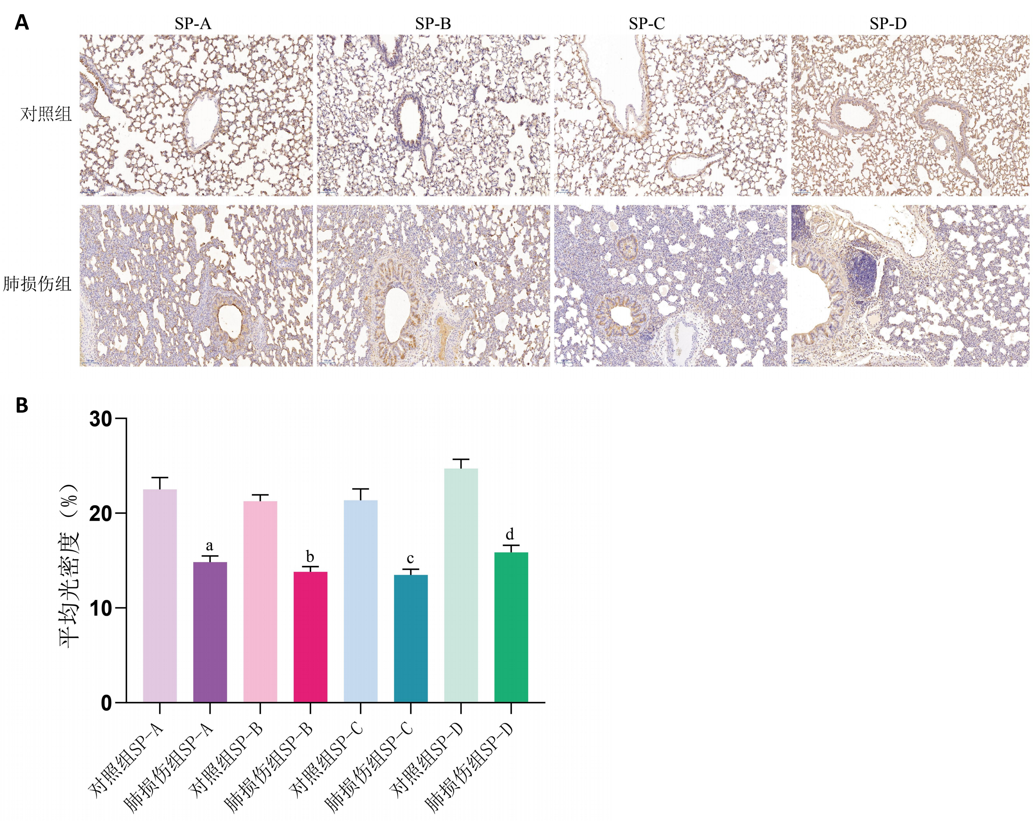 检测SP-A、SP-B、SP-C、SP-D的变化。通过脱水、包埋、切片进行组织石蜡包埋切片,待水烤干蜡烤化后取出常温保存备用。然后进行石蜡切片免疫组织化学实验,使用显微镜镜检及Image-pro plus 6.0软件(Media Cybernetics,Inc.,Rockville,MD,美国)进行图像采集及分析。