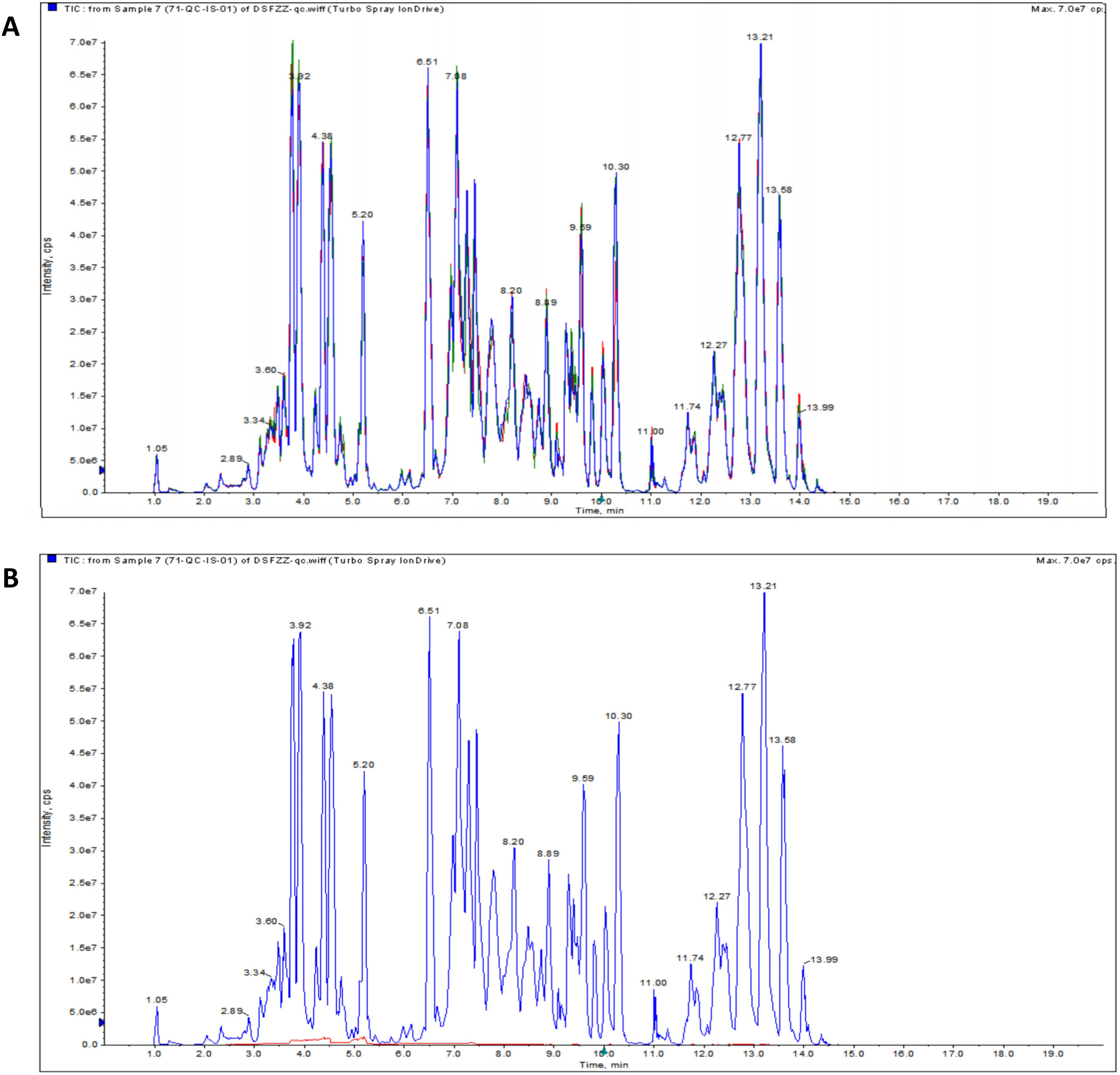 质量控制结果表明,QC样品TIC保留时间与峰面积重叠良好(图 2A),证实仪器稳定性优异;空白样品无显著干扰峰(图 2B),表明物质残留控制有效且无交叉污染。