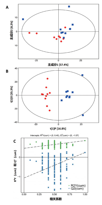 注:A: PCA得分图;B: OPLS-DA得分图;C: OPLS-DA模型的置换检验结果(红色圆形代表对照组,蓝色正方形代表肺损伤组) 图 4 PCA、OPLS-DA分析 Fig 4 PCA and OPLS-DA analysis