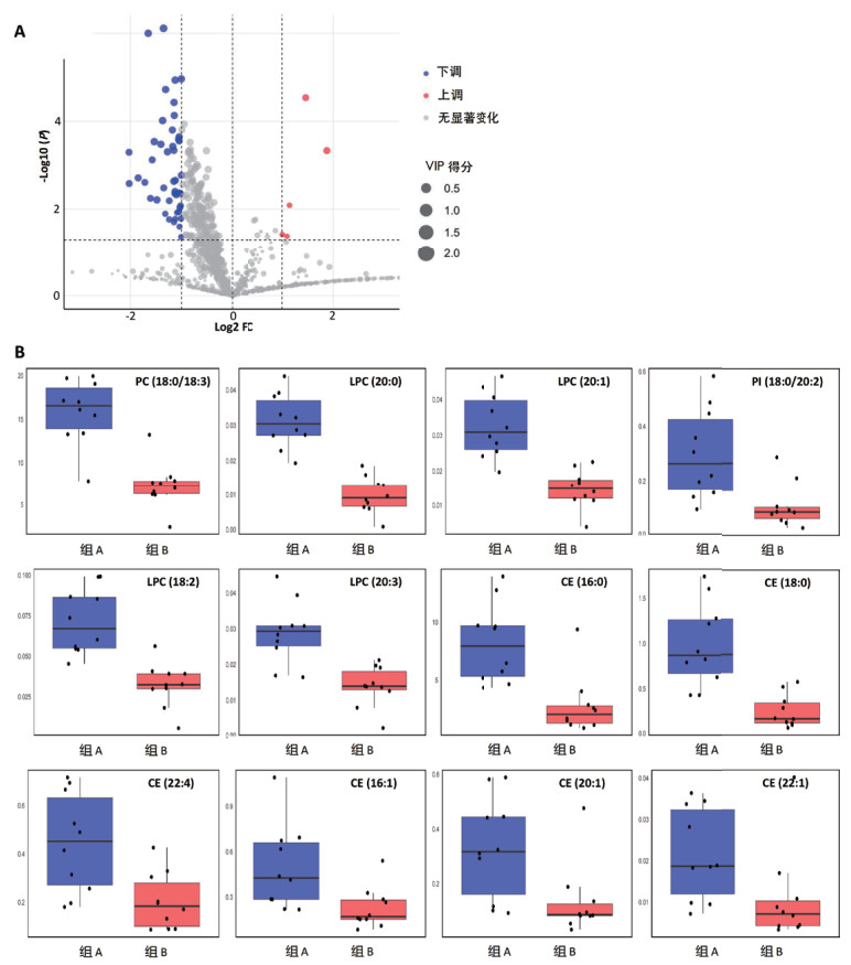 注:A:肺损伤组与对照组肺组织差异脂质代谢物的火山图。B:肺损伤组与对照组的差异脂质分子表达(组A:对照组;组B:肺损伤组)。 图 5 组间差异分析 Fig 5 Intergroup Difference Analysis