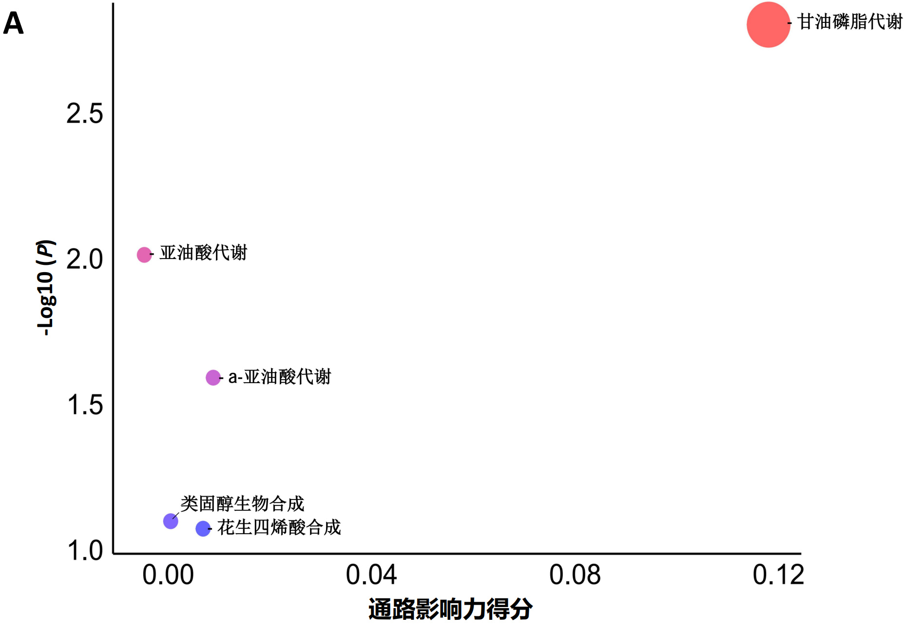 注:颜色:红色代表通路关联的P值更小(统计学显著性更高),蓝色代表P值更大;圆圈大小:圆圈越大,对应通路影响力得分越高 图 6 代谢通路分析 Fig 6 Metabolic Pathway Analysis
