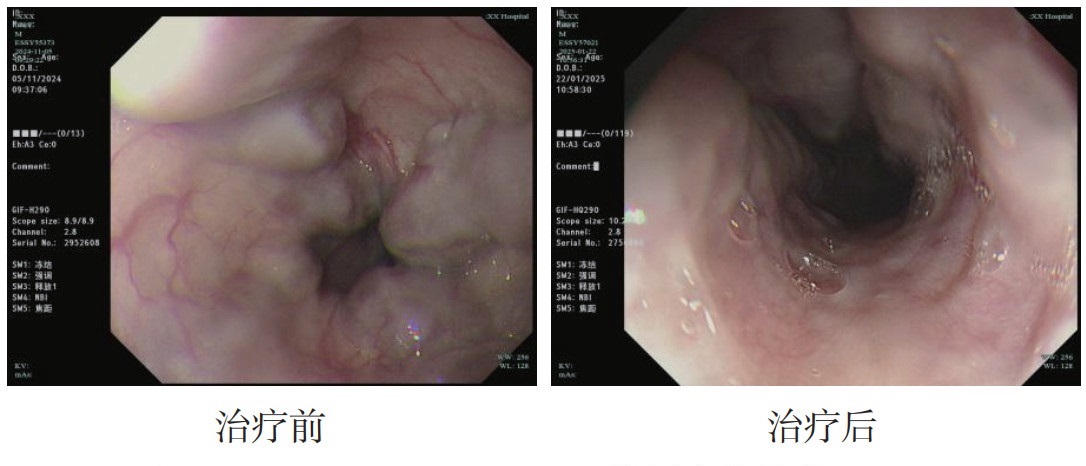 | 图 1 EUS-SVD治疗前后食管胃底静脉曲张变化 |