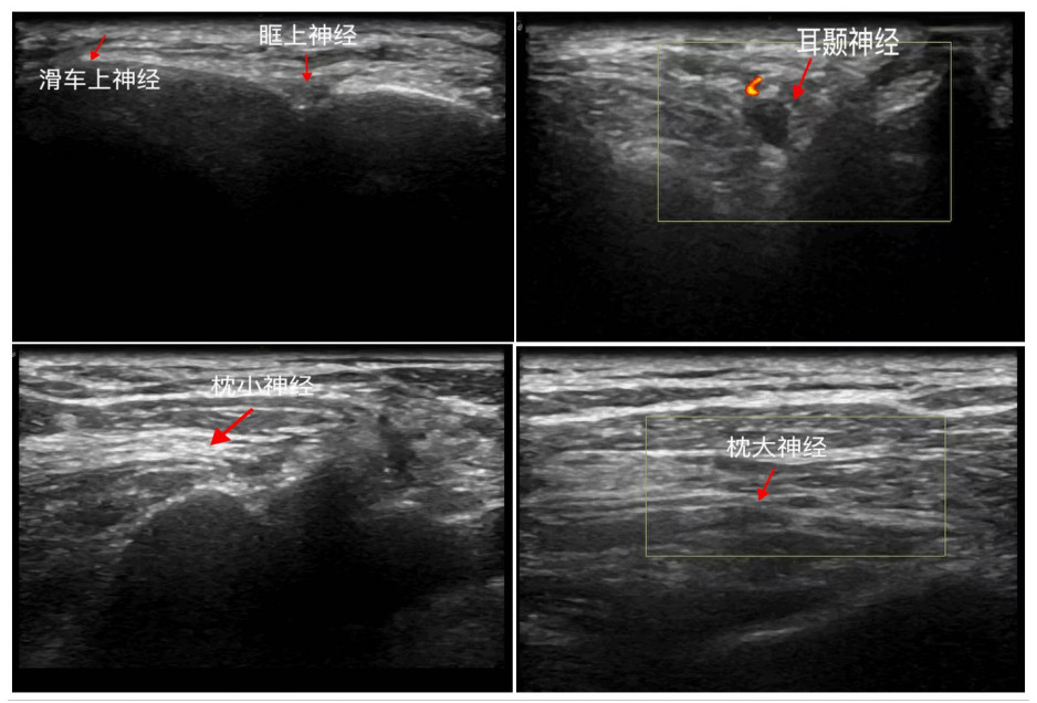 干预措施:两组患者静脉输注负荷剂量右美托咪定(批号:12407291,遂成药业股份有限公司)1 μg/kg 10 min,后以0.3 μg/(kg·h)的速率持续泵注。SD组在气管插管机械通气完成后,行手术侧超声引导SNB,给予0.6%的甲磺酸罗哌卡因注射液(批号:24112951,石家庄四药有限公司),分别行眶上(2 mL)、滑车上(2 mL)、耳颞(2 mL)、枕大(5 mL)和枕小(5 mL)神经阻滞(图 1)。所有操作由两名熟练掌握超声引导SNB的高年资麻醉医师完成。