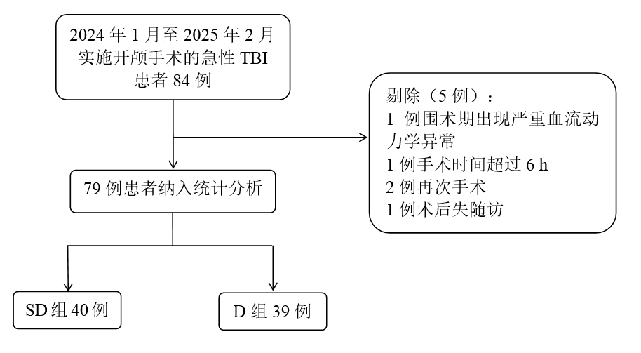 2 结果 2.1 患者的一般情况本研究最初选择实施手术治疗的急性TBI患者84例,后剔除5例,1例围术期出现严重血流动力学异常,1例手术时间超过6 h,2例再次手术,1例术后失访,最终79例患者纳入统计分析,其中SD组40例,D组39例(图 2)。两组患者一般资料比较差异均无统计学意义(均P > 0.05),见表 1。
