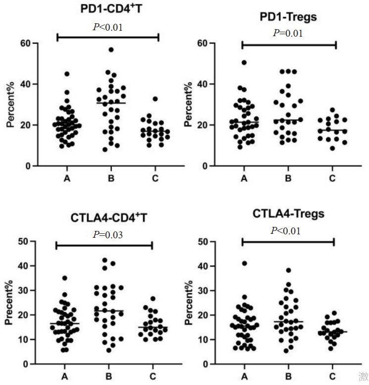 按照不同组别分为普通脓毒症组(n=37)、脓毒症休克组(n=28)、对照组(n=20),CD4+中PD-1、CTLA-4占比差异有统计学意义(F=6.94,P<0.01;F=4.17,P=0.03),其中A组和B组较C组升高(PD1:均数差为8.10,P<0.01;均数差为7.41,P<0.01;CTLA-4:均数差为5.81,P<0.01;均数差4.86,P=0.03;),B组比A症组升高更明显(PD1:均数差为8.10,P<0.01;CTLA-4:均数差为5.81,P=0.03)。三组在CD8+中PD-1、CTLA-4占比差异无统计学意义(F=0.84,P=0.41;F=0.24,P=0.81)。三组在Tregs中的PD-1、CTLA-4占比差异有统计学意义(F=4.41,P=0.01;F=5.29,P<0.01),A组和B组较C组升高(PD1:均数差为8.34,P<0.01;均数差为7.72,P<0.01;CTLA-4:均数差为6.33,P<0.01;均数差5.18,P=0.01);A、B组相比差异无统计学意义(PD1:均数差为4.53,P=0.05;CTLA-4:均数差为2.90,P=0.09)。见图 1。