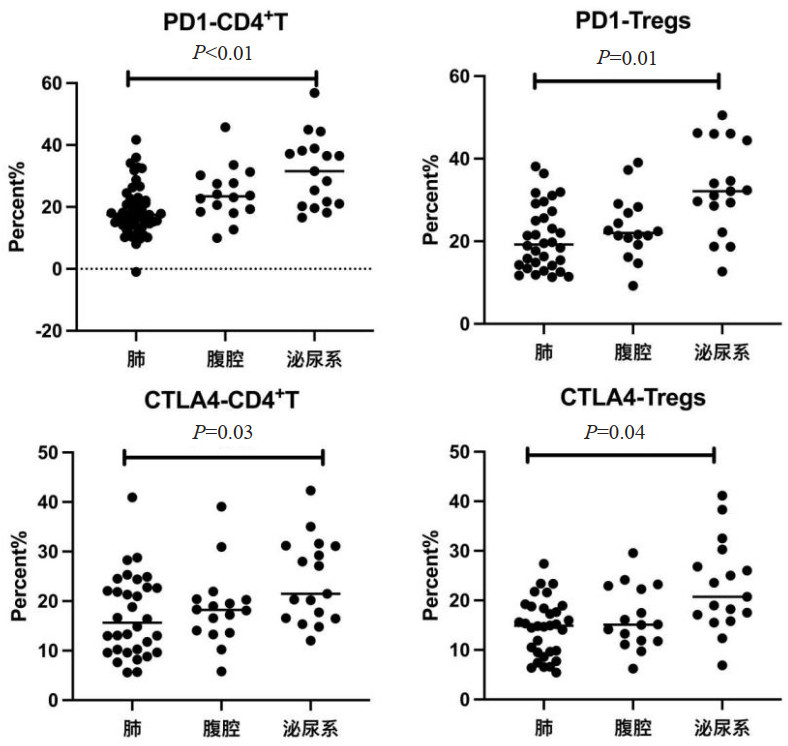 2.2 不同感染部位PD-1、CTLA-4表达按照不同感染部位分为肺部感染组32例,腹腔感染组16例,泌尿系感染组17例。在不同感染部位中,CD4+中PD-1、CTLA-4占比差异有统计学意义(F=5.33,P<0.01;F=4.08,P=0.03),以泌尿系感染升高明显(PD-1:均值差为11.21,P<0.01;均值差为7.23,P=0.03;CTLA-4:均值差为7.11,P<0.01;均值差为5.89,P=0.04)。三组在CD8+中PD-1、CTLA-4占比差异无统计学意义(F=0.97,P=0.38),Tregs中PD-1、CTLA-4占比差异有统计学意义(F=4.81,P=0.01;F=3.93,P=0.04),以泌尿系感染升高明显(PD-1:均值差为12.02,P<0.01;均值差为9.37,P<0.01;CTLA-4:均值差为8.28,P<0.01;均值差为6.25,P=0.01)。见图 2。