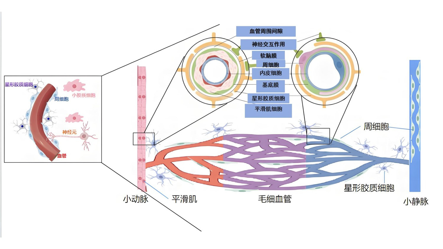 相对于分离性的观察脑血管以及脑神经的损伤,近年来逐渐把NVU作为脑损伤综合性治疗的靶点,其中NVU主要由脑血管内皮细胞、神经元以及神经胶质细胞三者紧密交织而成的功能复合体[4]。其中:(1)脑血管内皮细胞包括如毛细血管和小静脉上的周细胞、小动脉上的基底膜和平滑肌细胞,是NVU中的主要血管舒缩效应器,调节血液运输[5],相邻细胞不连续的空间主要有细胞旁组织基底膜填充,维护神经系统完整性[6]。(2)神经元通过树突和轴突建立信号传输,神经元被神经胶质细胞包裹防止与血管细胞直接接触,并缓冲血液传播物质的影响[7]。(3)神经胶质细胞主要包括星形胶质细胞,其主要包裹毛细血管和小动脉构成NVU中最远腔的层。小胶质细胞是另一种类型的胶质细胞,在NVU中通过消除垂死的神经元和修剪无功能的突触来调节大脑功能,是中枢神经系统血管周围的免疫细胞[8]。NVU的原型功能中的一个重要作用是神经血管耦连,神经活动和血流之间的联系是响应于神经元代谢需求,具有高度的空间和时间对应性,如星形胶质细胞接受来自神经元释放的Ca2+、神经递质及自身产生释放分子介质从而激活平滑肌细胞改变血流灌注[9];周细胞可通过释放各种分子物质舒缩血管直径、改变血管通透性调整血管循环[10]。其中由内皮细胞、胶质细胞、周细胞、神经元突起和基底膜组成的血脑屏障(blood-brain barrier, BBB)是血液和中枢神经系统之间复杂而动态的界面,主要负责运输脑细胞正常代谢所必需的营养物质,并阻碍许多有毒化合物进入中枢神经系统,从而维持NVU微环境的稳态,为中枢神经系统的正常运作提供了重要支撑[11]。见图 2。