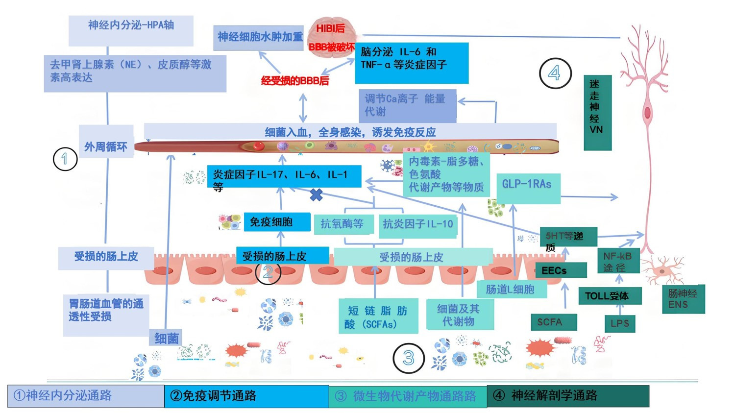 在HIBI神经内分泌途径中下丘脑-垂体-肾上腺轴被激活,使得神经内分泌调节紊乱[37],进而会引起胃肠激素、去甲肾上腺素、皮质醇等激素的高表达,这些激素会破坏肠道紧密连接,增加胃肠道血管的通透性,破坏肠道黏膜及正常的胃肠道功能,使胃肠道内的细菌有机会进入血液,进一步加剧了全身的炎症反应,同时脑细胞会进一步水肿、炎细胞会浸润,这些刺激会传递到大脑皮质的内脏中枢,然后信号会进一步传递到下丘脑、垂体以及胃肠道等靶器官释放大量胃酸,破坏粘膜上皮细胞,发生细胞氧化反应从而进一步加重缺血缺氧后的脑组织损伤,甚至影响了患者的整体预后[38]。