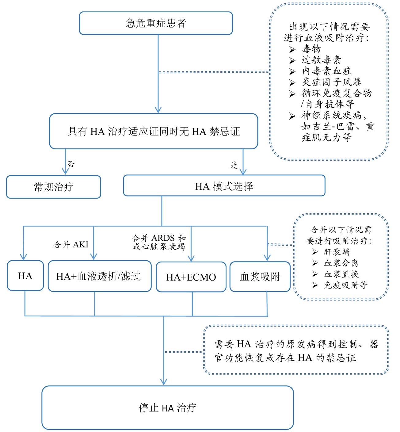 注: HA血液吸附;AKI急性肾损伤;ECMO体外膜肺氧合 图 1 急危重症患者HA治疗流程图