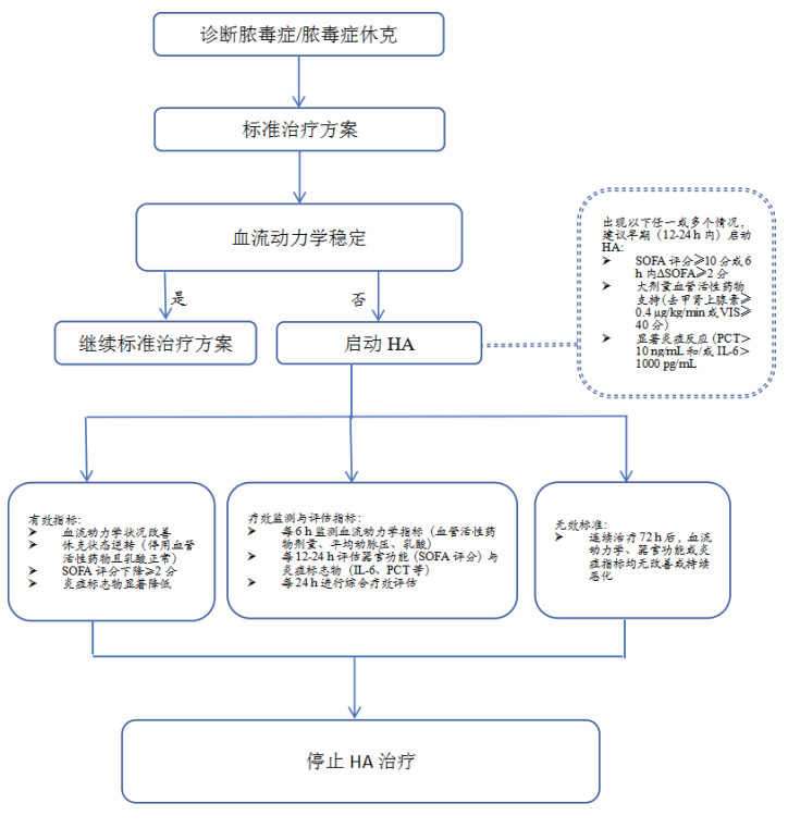 HA在脓毒症患者中的应用应从器官功能和炎症风暴两方面进行全面评估。器官功能评估满足以下任一条件即可考虑启动HA治疗:①序贯器官功能衰竭(sequential organ failure assessment, SOFA)评分≥10分,或6 h内ΔSOFA≥2分;②正在使用血管活性药物[去甲肾上腺素≥0.4 μg/(kg·min)或血管活性药物评分(vasopressor-inotropic score,VIS)≥40分)][38-40]。Fujimori等[41]的研究表明,HA疗效与SOFA评分在10~12分之间具有显著相关性。Chen等[42]开展的多中心、随机化对照研究旨在评估HA对脓毒性休克患者的疗效,纳入了200例符合以下条件的患者:去甲肾上腺素≥0.4 μg/(kg·min)(或等效剂量其他血管活性药)、降钙素原(procalcitonin, PCT)≥50 μg/L和/或IL-6≥1 000 pg/mL。该RCT设计首次以前瞻性方式验证了“去甲肾上腺素≥0.4 μg/(kg·min)”作为启动HA的血流动力学阈值。
