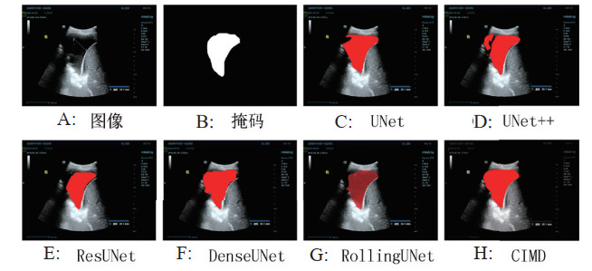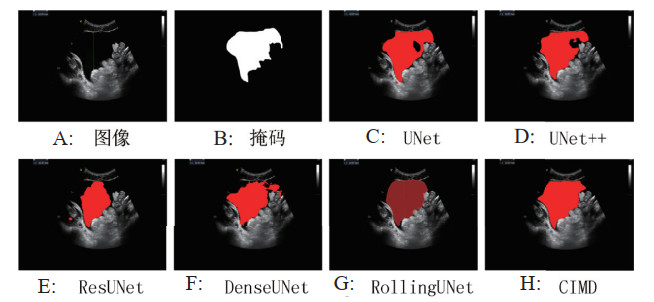 图 2图 3分别展示了一组胸部和腹部超声FAST图像分割结果,其中A为超声图像,B为由医生标注生成的出血区域掩码,C~H为六种图像分割模型的分割结果。红色区域为每种模型的分割结果,可以看出,CIMD方法的分割结果更接近真实的出血区域。