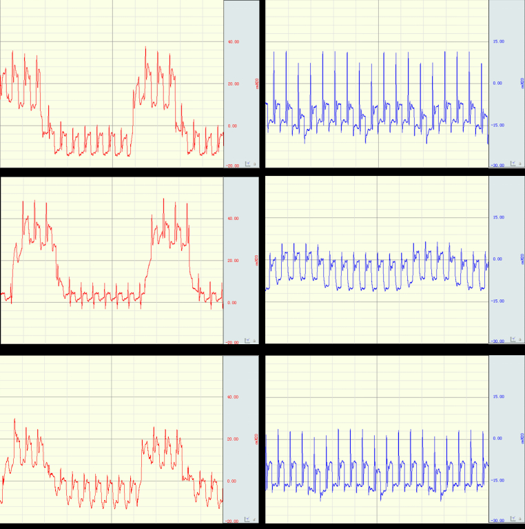 | 注: 左侧列为气道压力, 右侧列为胸腔压力; 上为CPRV组, 中为IPPV组, 下为ITD组 图 2 各组ACLS 8 min时气道压及胸腔压力 Fig 2 Airway pressure and intrathoracic pressure at 8 min of ACLS in each group |