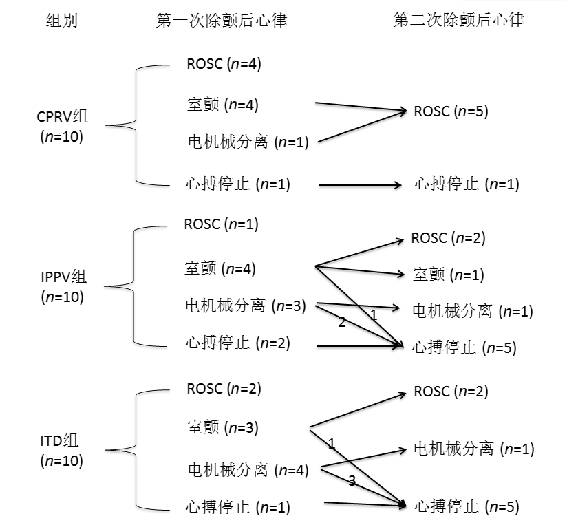 本研究中无论是第一次除颤后ROSC率还是总ROSC率, CPRV均高于IPPV及ITD。分析其可能相关机制有: (1) CPRV能够较IPPV及ITD减少CPR时肺容积丢失, 减少肺泡塌陷, 改善通气和氧合, 纠正低氧和二氧化碳潴留; (2) CPRV产生的更大胸腔压力变异度使CPR的胸泵原理得到加强, 从而有更佳的血流动力学; (3) CPRV由于改善通气、氧合及血流动力学状态, 体内内环境酸碱平衡紊乱较轻, 从而增加血管活性药物及电除颤的效能, 使第二次除颤ROSC率亦较高。