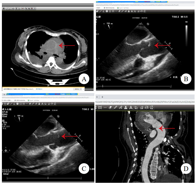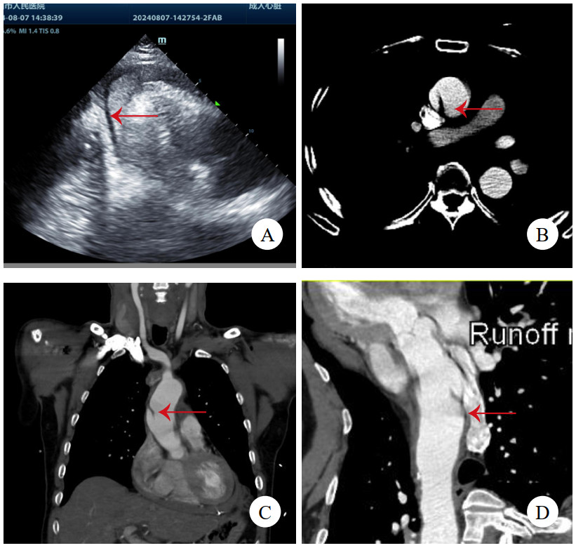 病例3,男,60岁,因“半小时前晕厥1次”就诊。送入抢救室时见患者大汗淋漓,显著呼吸困难,查体:心率97次/min,血压76/52 mmHg(1 mmHg=0.133 kPa),精神极软,颈静脉怒张,心音低钝,未及心脏杂音。立即查床边TTE,见大量心包积液(图 3A)。符合心包填塞,予心包穿刺,见血性液体流出约100 mL后,患者胸闷缓解,心率下降,血压138/88 mmHg。查主动脉CTA,见升弓交界靠上腔静脉侧LIT(图 3BCD),该处主动脉直径为31 mm,局部外膜薄层血肿形成。建议手术,患方拒绝,在抢救室留置6 h后生命体征突然消失,后宣布临床死亡。