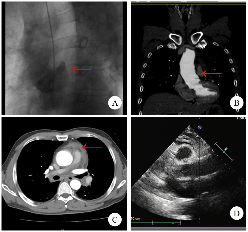 注:A为主动脉造影,箭头示根部后壁斜行龛影;B为主动脉CTA,箭头示左冠状动脉开口上方条状影;C为箭头示升主动脉周围少量心包积血;D为TTE见升主动脉人工血管通畅 图 2 例2患者主动脉根部造影、术前CT及术后TTE影像