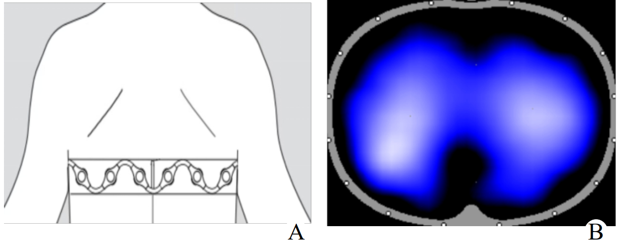 EIT是一种基于电抗变化的非侵入性医学成像技术,其核心原理基于生物组织的导电性差异,推断组织的电导率分布,从而反映组织的生理状态[5]。通过环绕胸部的多电极阵列(通常为16或32电极)施加安全交变电流,检测体表电压变化,利用逆问题算法重建胸腔横断面的阻抗分布图像。肺组织因通气与血流变化引起局部电导率改变,EIT可据此动态捕捉通气不均、肺泡塌陷或过度膨胀等病理状态[6],研究人员可依据获取的数据,借助相关数学算法进行图像重建,进而提供肺部功能与结构的相关信息;经过进一步数据处理,还能实时观察患者肺部的通气及血流情况[7-8]