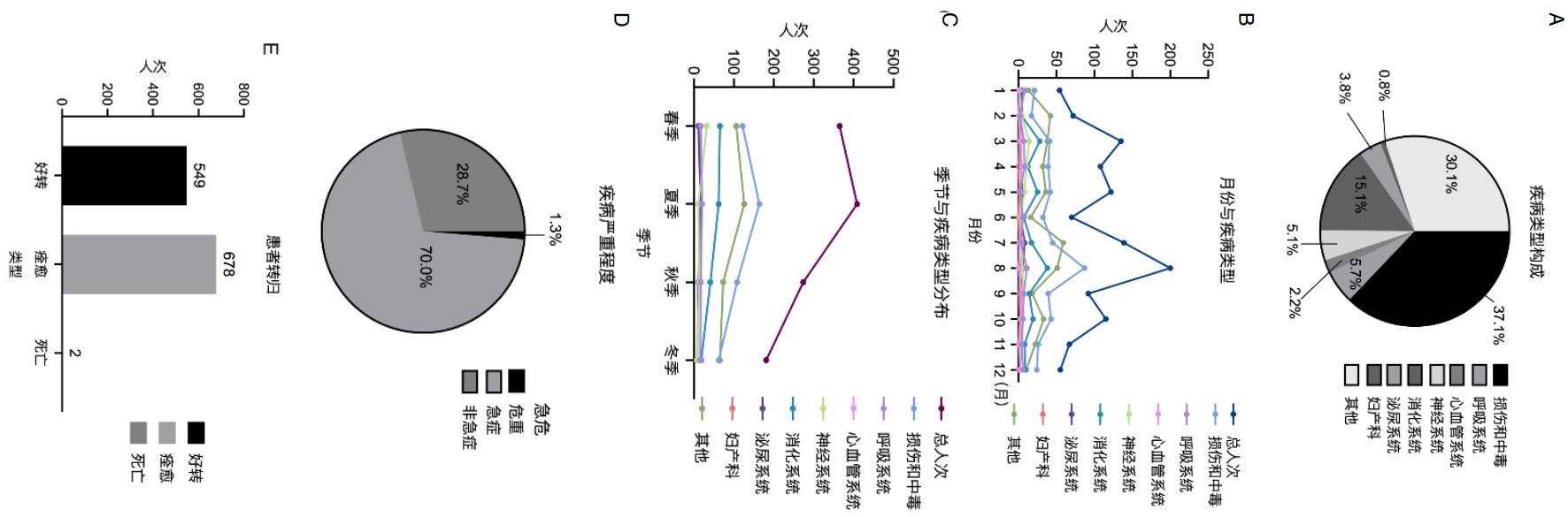 | 注:图A为疾病类型构成;B为月份与疾病类型分布;C为季节与疾病类型分布;D为疾病严重程度构成;E为患者转归情况 图 2 2023年普陀山1229例院前急救病例的疾病特点与转归 |