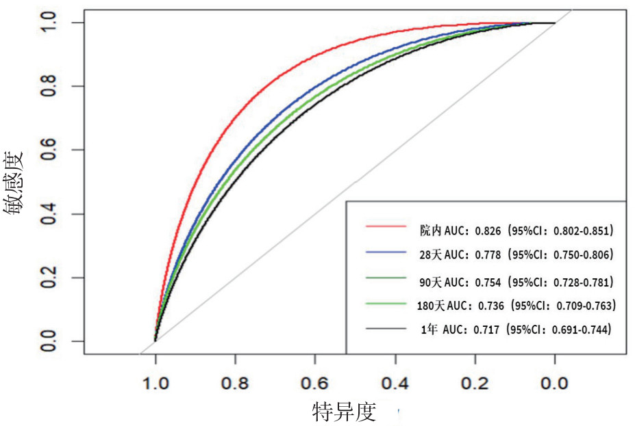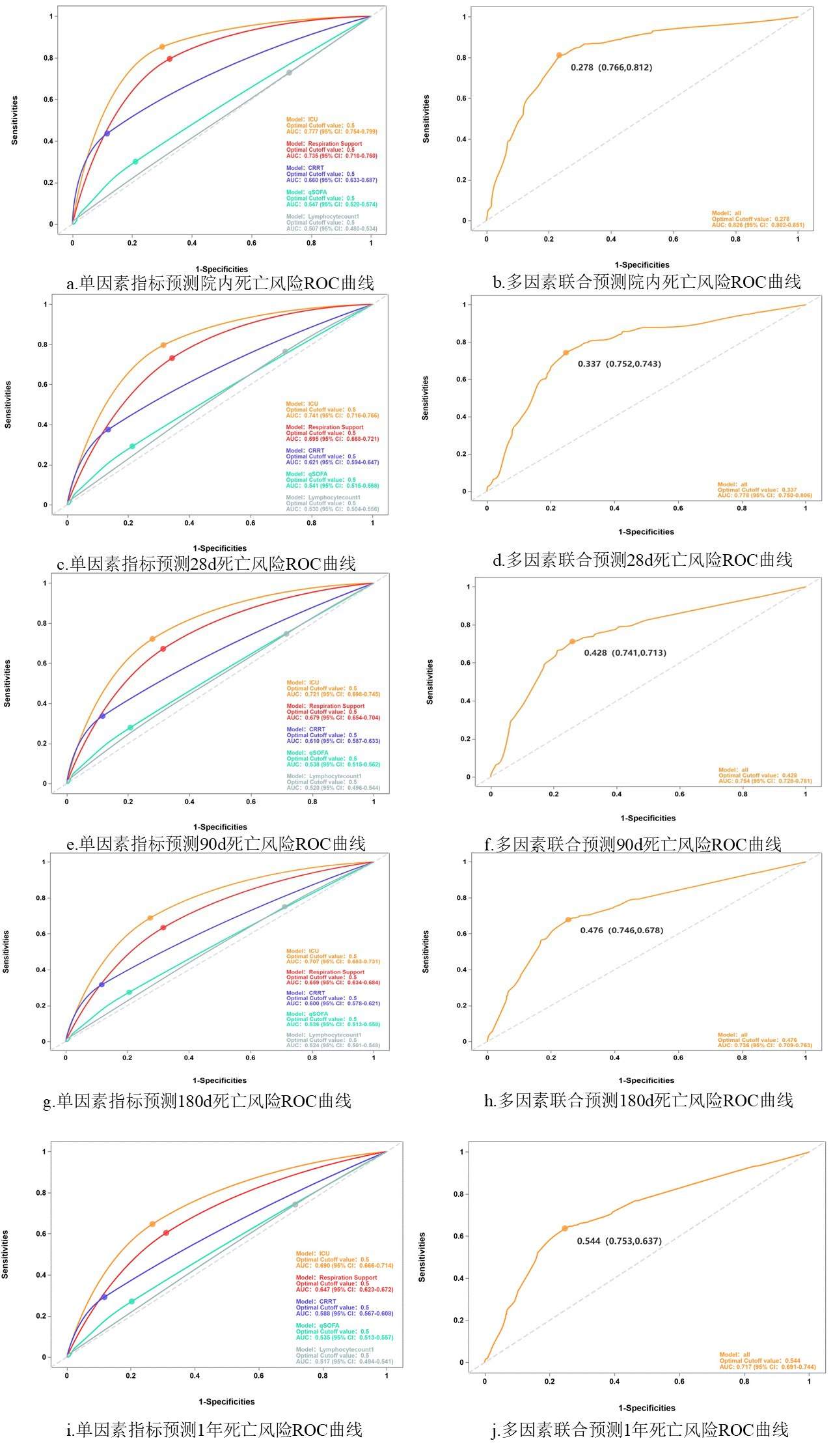 1.2.4 预测模型构建与验证① 预测因子筛选:将收集的潜在预测变量(包括基线资料、临床指标、治疗干预)纳入单因素Cox比例风险回归分析,筛选P < 0.05的变量。进一步采用多因素Cox比例风险回归模型(向后逐步回归法,剔除标准P > 0.05),最终确定独立预测因子,并计算风险比(hazard ratio, HR)及其95%置信区间(CI)。②多因素联合预测模型构建:基于多因素Cox回归分析确定的独立预测因子及其回归系数(β值),构建用于预测老年脓毒症患者不同时间点(院内、28 d、90 d、180 d、1年)死亡风险的多因素联合预测模型。该模型通过Cox回归方程体现各预测因子对风险的贡献。③模型性能评价:区分度(discrimination):采用ROC曲线计算各时间节点(院内、28 d、90 d、180 d、1年)曲线下面积(AUC)。比较联合模型与单一最佳预测因子(ICU治疗)的AUC,采用DeLong检验评估差异。