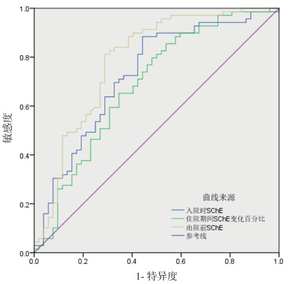 | 图 1 入院时SChE、出院前SChE以及住院期间SChE下降百分比预测90 d死亡的ROC曲线 Fig 1 ROC curves for predicting 90-day mortality based on admission SChE, pre-discharge SChE, and in-hospital SChE reduction |