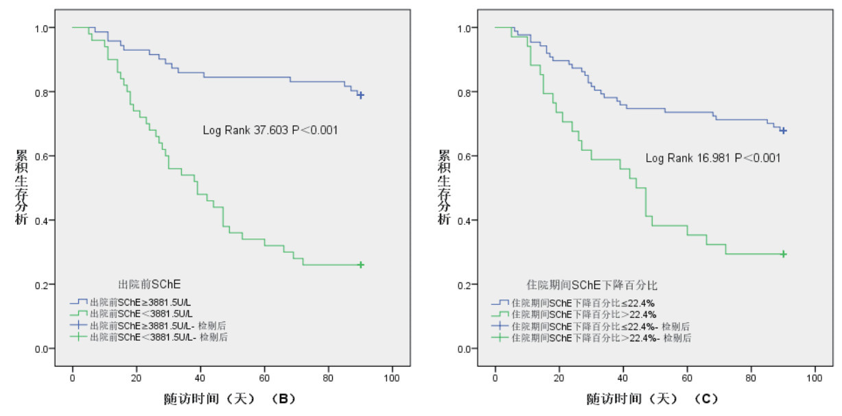 根据入院时SChE最佳截断值分为≥4 020 U/L和<4 020 U/L两组,Kaplan-Meier生存曲线显示<4 020 U/L组90 d累积生存率显著低于≥4 020U/L组(21.6% vs. 72.6%,Log-rank 38.025,P<0.001)(图 2A)。根据出院前SChE最佳截断值分为≥3 881.5 U/L和<3 881.5 U/L两组,Kaplan-Meier生存曲线显示<3 881.5 U/L组90 d累积生存率显著低于≥3 881.5 U/L组(26.0% vs. 78.9%,Log-rank 37.603,P<0.001)(图 2B)。根据住院期间SChE下降百分比最佳截断值分为≤22.4%和>22.4%两组,Kaplan-Meier生存曲线显示>22.4%组90 d累积生存率显著低于≤22.4%组(29.4% vs. 67.8%,Log-rank 16.981,P<0.001)(图 2C)。