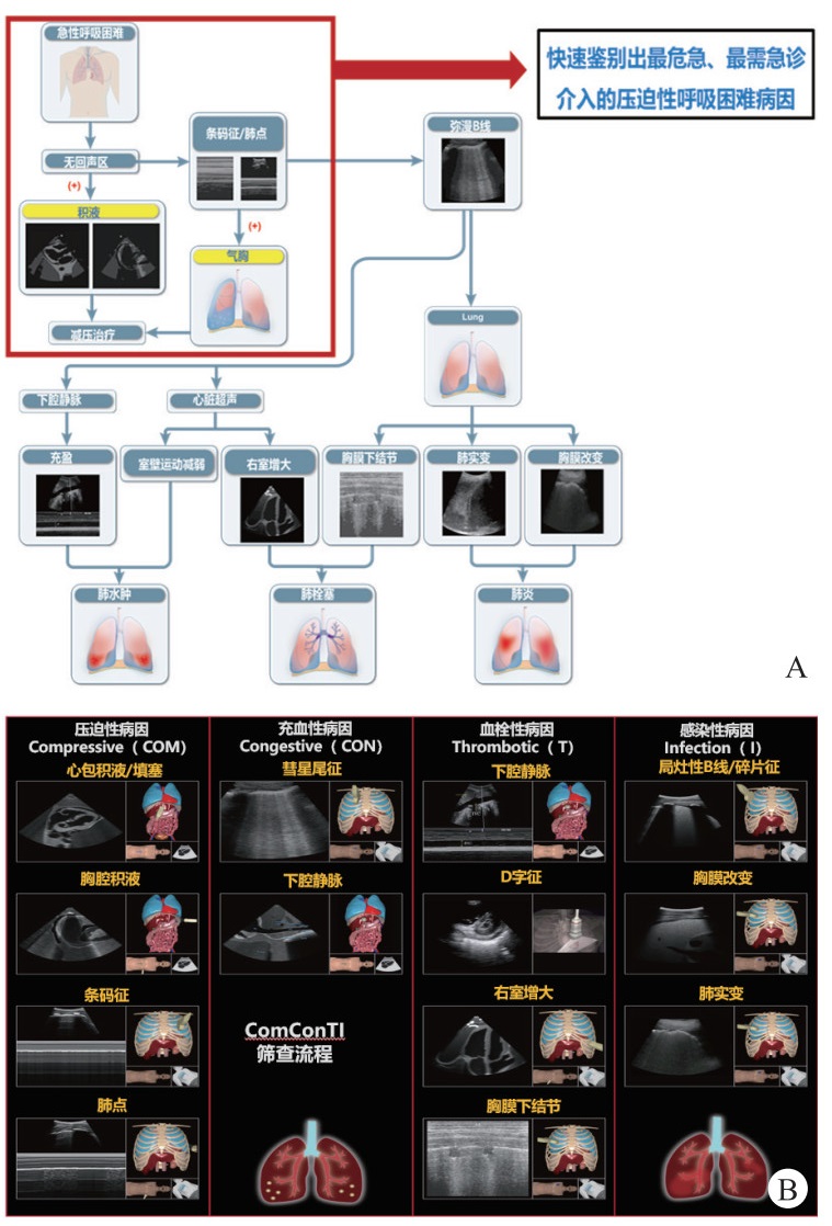 | 图 3 急性呼吸困难POCUS筛查ComConTI流程示教图:A筛查流程B各病因病理征象 Fig 3 Illustrative diagram of the ComConTI protocol for screening acute Dyspnea |