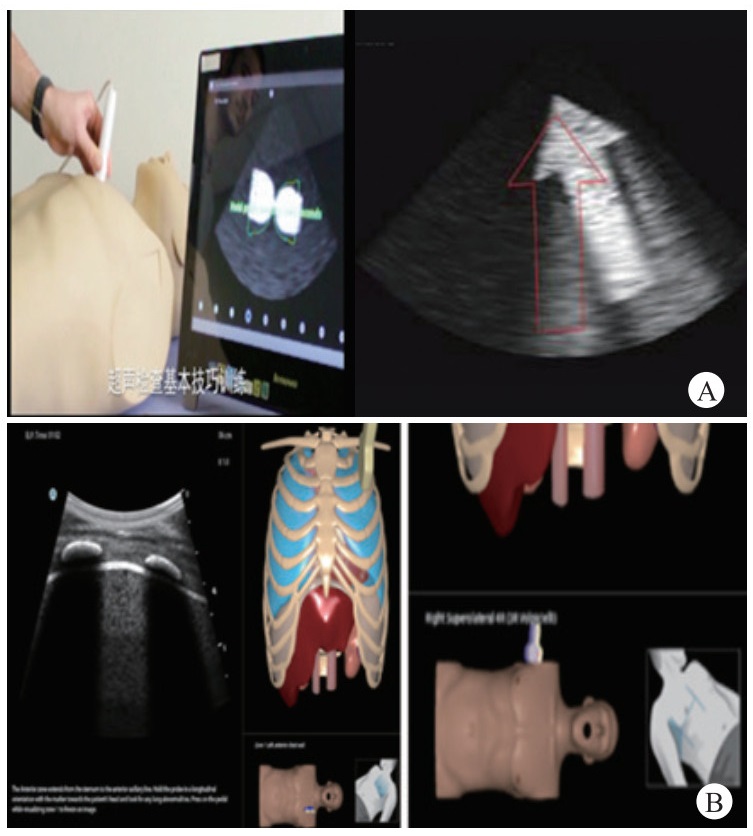 | 图 4 A:基本技巧训练模块; B:肺部超声训练模块 Fig 4 A: Basic skills training module; B: Lung ultrasound training Module |