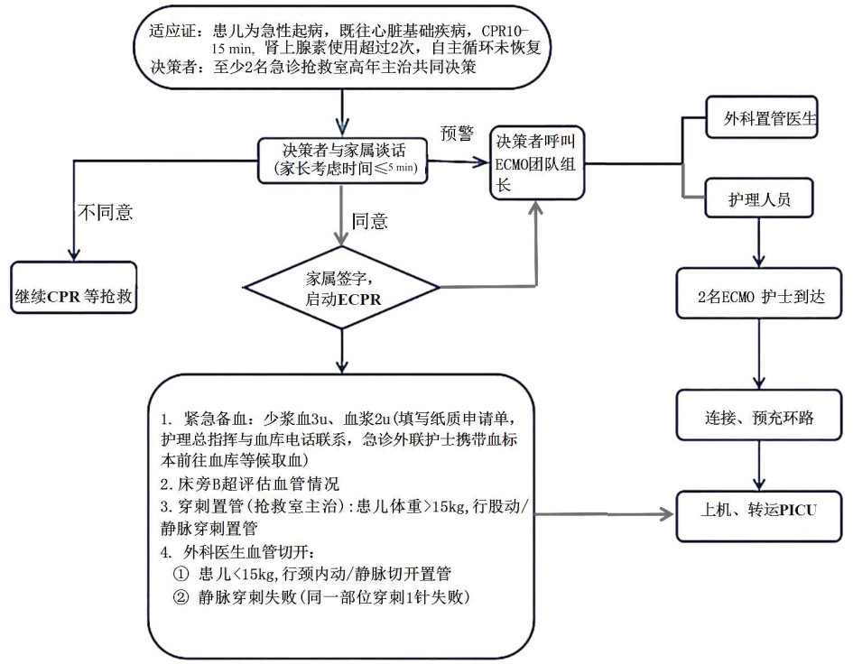 体外心肺复苏(external cardiopulmonary resuscitation,ECPR)[1]是指在传统心肺复苏(conventional cardiopulmonary resuscitation, CCPR)实施期间,或在自主循环恢复后20 min内(无持续按压的情况下),启动体外膜肺氧合(extracorporeal membrane oxygenation,ECMO)支持,是CCPR无效患者逆转心肺骤停的最有效治疗[2]。儿童ECPR近些年发展迅速,但实施存在巨大挑战,它需要良好的团队响应和合作、适合的流程等[3]。在重症监护病房或手术室以外的区域对儿童实施ECPR缺少尝试。应急团队无法及时响应、多学科配合度差等均显著影响了非ICU环境下ECPR的高效实施[4-5]。