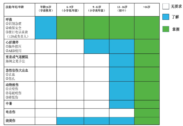 建立校园急救技能培训体系的核心目标是保障学生生命安全和健康利益。除已获卫生部门、红十字协会或美国心脏病协会等颁发培训证书的人员外,所有师生都应接受校园急救技能培训。考虑学生年龄、生理和心理特点,培训师资队伍应具备多学科背景,包括急诊医学专家、教育专家、心理健康专家和校园卫生专家。校园急救技能培训系统应允许培训导师根据学校人员类别,以及学生年龄情况,提供个性化的分层培训。