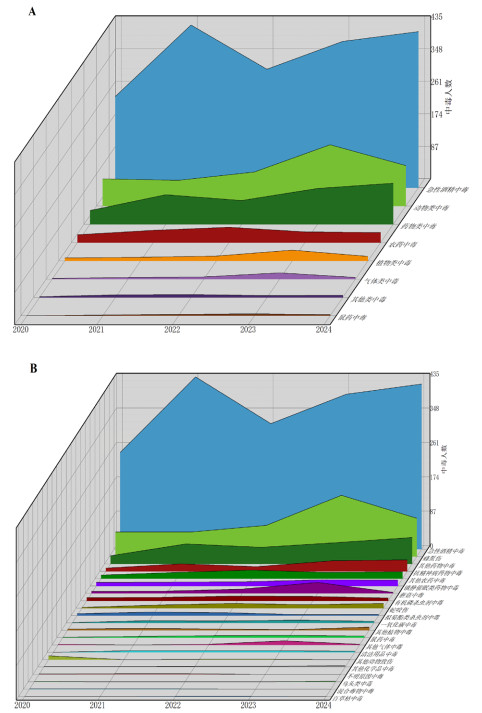 注:A为急性中毒一级诊断类型;B为急性中毒二级诊断类型 图 2 重庆市万州区2020—2024年急性中毒年度变化趋势 Fig 2 Temporal trends of acute poisoning in Wanzhou District, Chongqing, 2020–2024