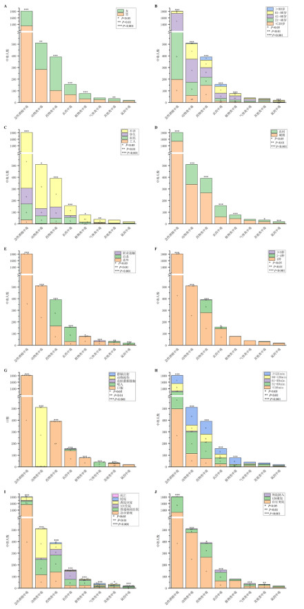 性别与年龄分层结果显示,急性酒精中毒与动物类中毒以男性为主,药物类、农药、植物类及其他类中毒多见于女性,急性酒精中毒好发于20~60岁人群,20岁以下人群为药物类中毒不可忽视的发病群体,且学生群体与其他职业相比在职业分层中差异有统计学意义(图 4A~4C)。农药与鼠药中毒以农村人口居多,药物类、农药及鼠药中毒多为蓄意自杀,此外,药物与农药中毒还是同时接触2种及以上毒物的主要类型(图 4D~4F)。除农药与其他类中毒途径较为多样外,其余类型中毒途径相对单一(图 4G)。植物类中毒就诊时间多超过2 h,其他类型中毒多在2 h内就诊(图 4H)。农药中毒患者中120入院、入住ICU和急诊死亡的比例均较高(图 4I4J)。
