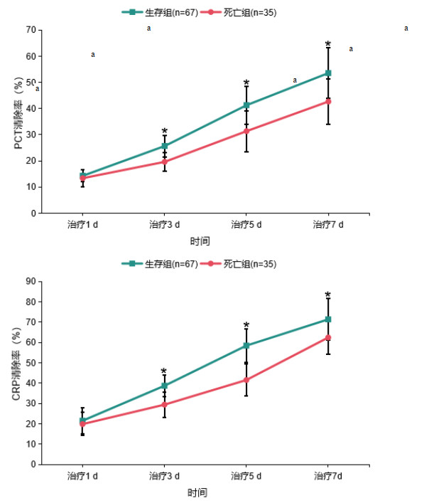 | 注:a为P < 0.05 图 2 两组不同治疗时间点PCTc、CRPc动态变化 Fig 2 Dynamic changes in PCT and CRP clearance rates at different treatment time points in the two groups |