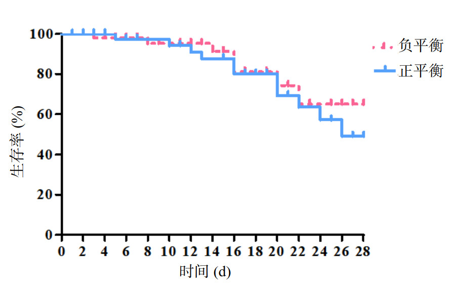 | 图 3 液体负平衡与正平衡患者的28 d累积生存率比较 Fig 3 Comparison of 28-day cumulative survival rates between patients with negative and positive fluid balance |