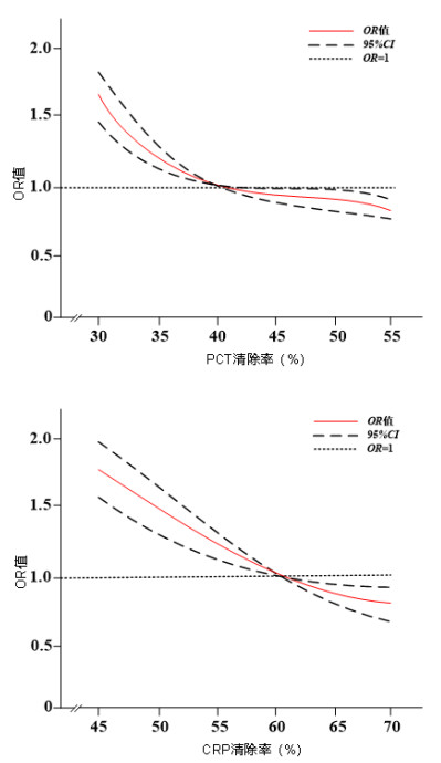 | 图 4 治疗7 d后PCTc、CRPc对治疗28 d死亡风险的RCS分析 Fig 4 RCS analysis of PCT and CRP clearance rates after 7 days of treatment on 28-day mortality risk |