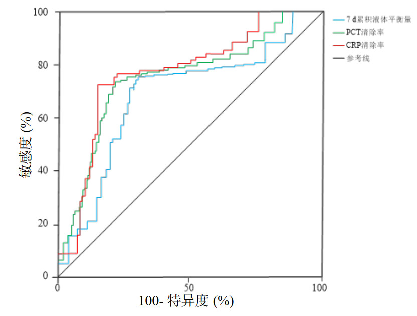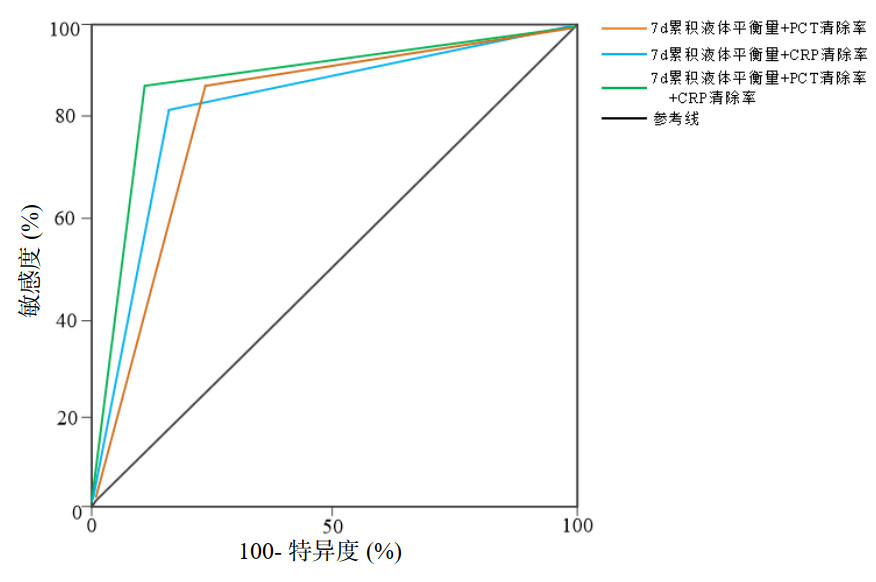 | 7 d累积液体平衡量+CRP清除率 | 0.844 | 0.049 | 0.814~0.899 | 0.009 | 0.806 | 0.877 | - |