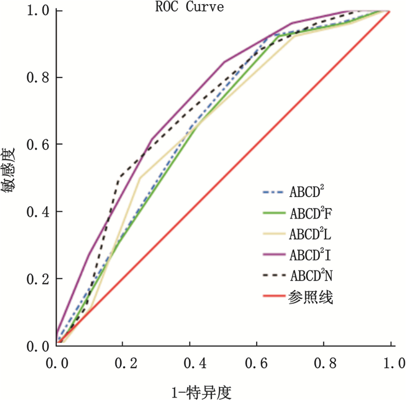 2.2 ABCD2、ABCD2L、ABCD2I、ABCD2F、ABCD2N 5种评分方法的比较预测2 d脑梗死时5种评分方法的ROC曲线下面积分别为 ABCD2:0.67(95%CI:0.57~0.76);ABCD2L:0.65(95%CI:0.55~0.75);ABCD2I:0.73(95%CI:0.64~0.82)、ABCD2F:0.65(95%CI:0.56~0.75)、ABCD2N:0.70(95%CI:0.61~0.80),见表1与图1。ABCD2I在预测2 d时脑梗死风险有更佳临床价值。