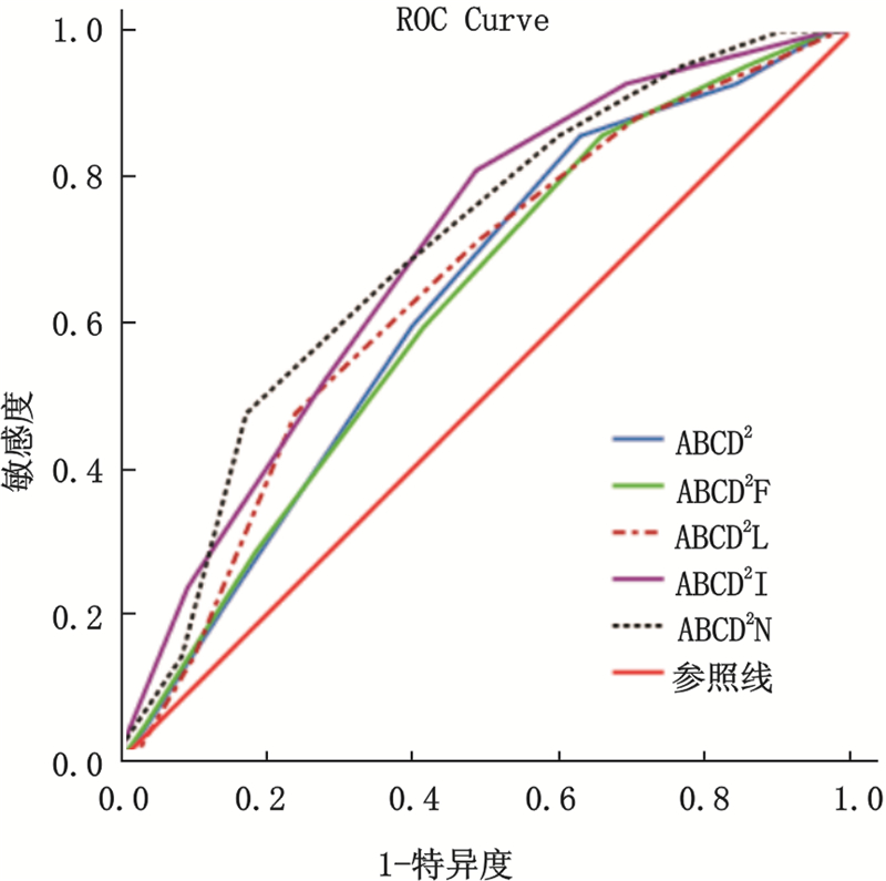 1.4 统计学方法全部数据采用SPSS 16.0进行分析,计量资料用均数±标准差(x±s)表示,ABCD2、ABCD2L、ABCD2I、ABCD2F、ABCD2N 5种评分方法的预测脑梗死价值比较采用ROC曲线分析,危险分层为高、中、低危组的TIA患者近期脑梗死发生率比较采用χ2检验,以P < 0.05为差异具有统计学意义。