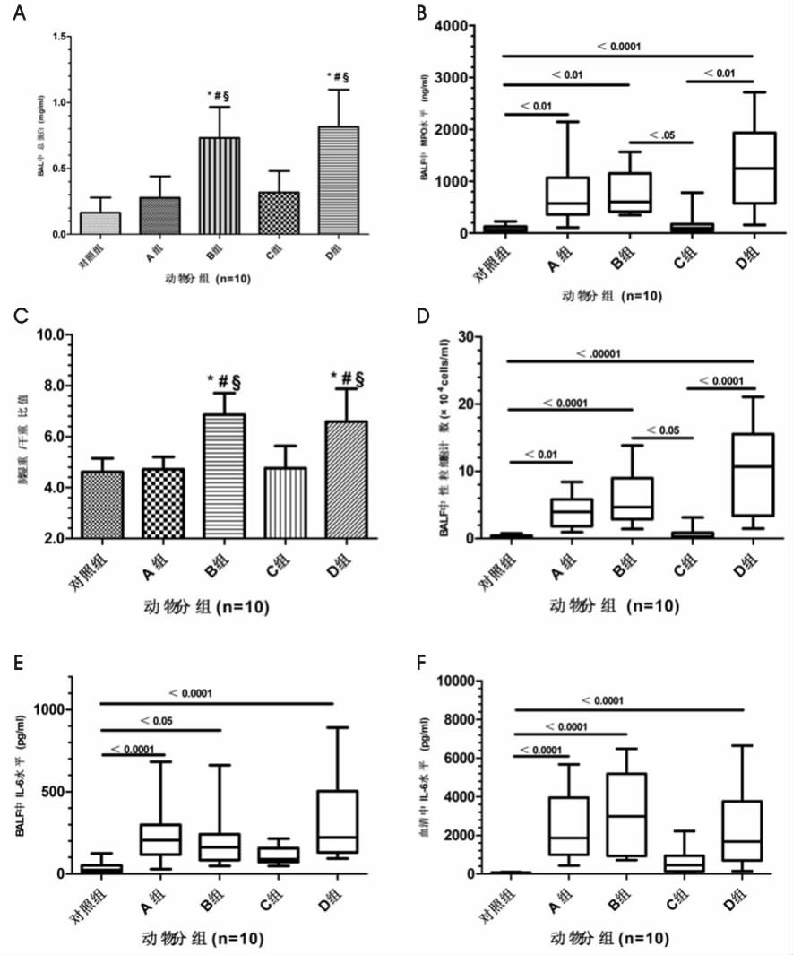 肺炎症反应BALF 中(3)NC 或(4)IL-6或(5)MPO的水平≥对照组中相应指标测量平均值+2倍标准差至少符合 (3) -(5)项中任何一个