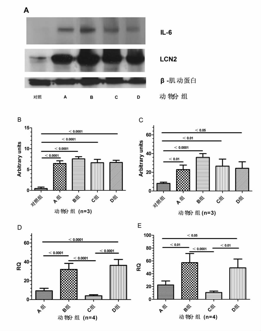 以TRIzol试剂(Life technology,美国)提取冻存肺组织RNA并完成逆转录。使用power SYBR绿色PCR试剂和ABI PRISM 7300实时PCR仪(Life technology,美国)对逆转录产物中目标基因(IL-6、LCN2)的cDNA水平进行相对定量。