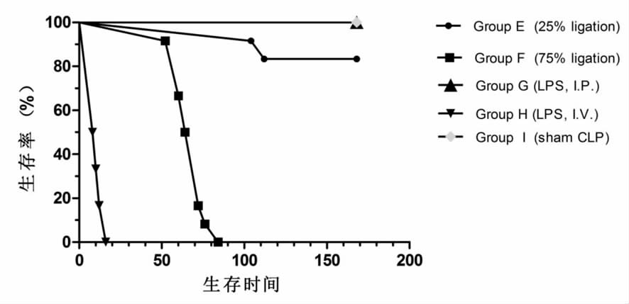42只小鼠随机(随机数字法)分为5组: E 组(n=12)、F组 (n=12)、G 组(n=6)、H组(n=6)分别模拟C组、D组、A组、B组建立脓毒症模型,I组(n=6)为假手术对照组。造模后3 d内予液体复苏,随访7 d。
