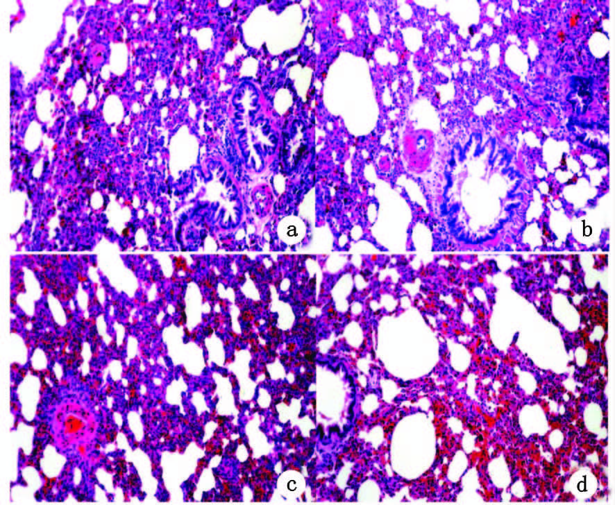 1.3 观测指标及方法 1.3.1 病理学变化及肺损伤病理学评分由包埋好的肺组织,行常规切片、HE染色,观察病理变化,同时由专业技术人员根据Mikawa等[3]、张素品等[4]标准做肺损伤评分,光镜下观察各肺组织水肿、出血 、炎性细胞浸润和小气道损伤等项病理改变 ,各按程度分为 5个等级 :0分为无该项病理改变或极轻 ;1分为病理变化轻且很局限;2分为病理变化中等;3分为病变中等但广泛或局部 显著 ;4分为非常显著的广泛性病理改变 。每张切片随机取10个高倍视野,每个视野病理评分为每项评分之和,10个视野的平均值为病理评分。