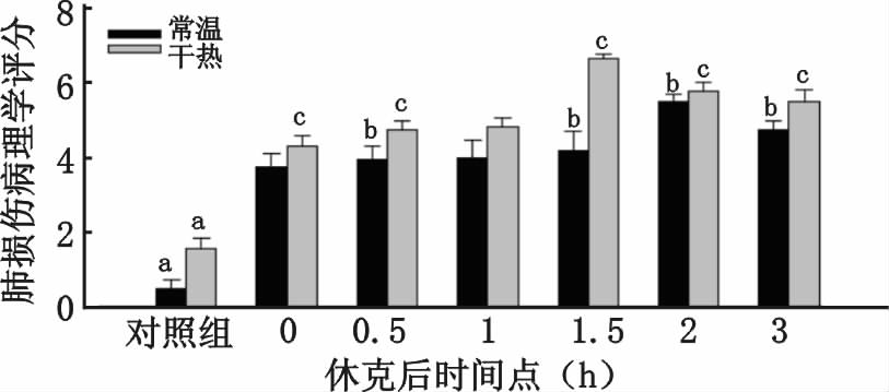| 常温组与干热组中对照组与休克后各时间点间比较,aP<0.05;常温组组内各时间点间比较,bP<0.05;干热组组内各时间点间比较,cP<0.05 图 2 各组大鼠肺损伤病理学评分 Fig. 2 Score of lung injury in rats |