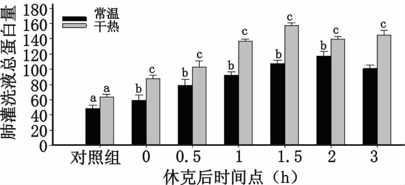 | 常温组与干热组中对照组与休克后各时间点间比较,aP<0.05;常温组组内各时间点间比较,bP<0.05;干热组组内各时间点间比较,cP<0.05 图 3 各组大鼠肺灌洗液总蛋白量 Fig. 3 Total protein in each lung lavage fluid of rats |
