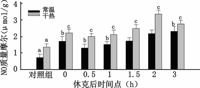 两组肺组织匀浆NO质量摩尔浓度总体比较差异具有统计学意义(t=2.472,P<0.05),干热组数值均大于常温组,干热组组内单因素方差分析差异具有统计学意义(F=6.77,P<0.01),常温组组内方差分析差异具有统计学意义(F=7.83,P<0.01)常温组与干热组肺组织匀浆NO质量摩尔浓度在休克后各时间点均高于对照组,干热组最大值(3.35±0.23)μmol/g出现在2.0 h早于常温组最大值(2.30±0.30) μmol/g(常温组最大值出现在3.0 h)出现,常温组与干热组NO质量摩尔浓度在复苏后0 h时均有显著升高,见图 4。