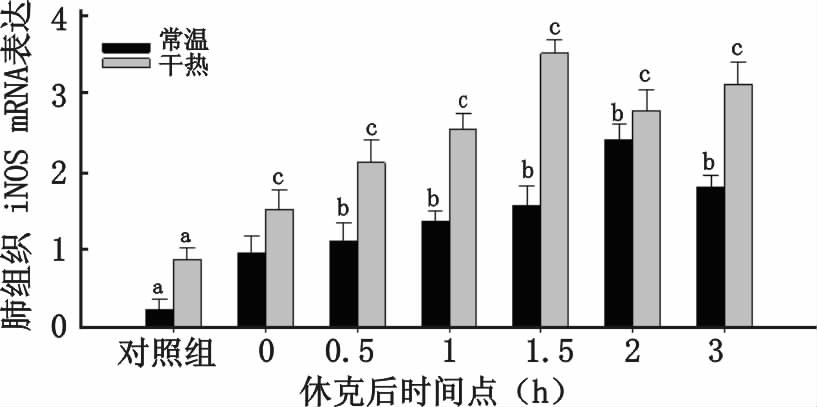 | a常温组与干热组中对照组与休克后各时间点间比较差异具有统计学意义,b常温组组内各时间点间比较差异具有统计学意义,c干热组组内各时间点间比较差异具有统计学意义,P<0.05. 图 5 各组大鼠肺损组织iNOS表达量 Fig. 5 Expression of iNOS in lung tissue of rats in each group |