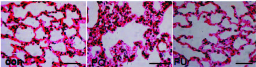 HE染色结果显示,Con组大鼠肺组织结构清晰,肺泡壁及肺泡隔形态正常。PQ染毒组肺组织结构部分破坏,部分肺泡壁塌陷,部分肺泡腔扩大,局部炎细胞浸润;可见肺泡隔显著增厚,明显的局部出血。PQ染毒UTI治疗组肺组织结构清晰,肺泡壁轻度水肿,局部见少量炎细胞浸润,可见肺泡隔轻度增厚,未见出血、纤维化。见图 1