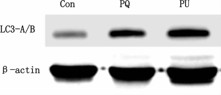 Western blot显示三组之间差异具有统计学意义(P<0.01):与Con组相比,PQ组LC3 A/B蛋白含量表达增高有统计学意义[LC3表达量(A值):(0.22±0.05) vs. (0.14±0.03)];PQ组相比,PU组中LC3 A/B蛋白含量表达增高有统计学意义[LC3表达量(A值):(0.36±0.08) vs. (0.22±0.05)],见图 2