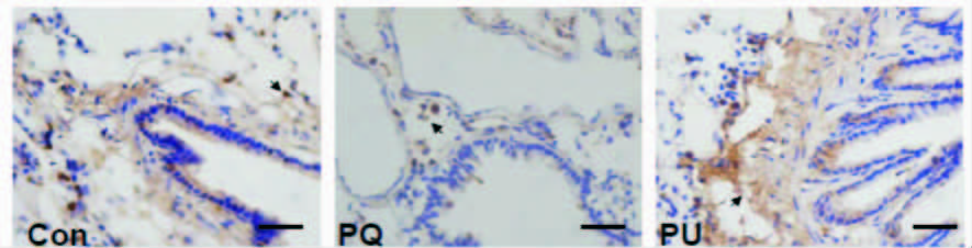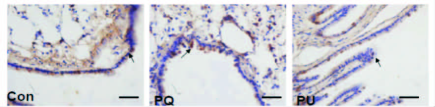 细胞定位:Bcl-2主要表达在细支气管黏膜柱状上皮细胞、杯状细胞胞质中,肺泡细胞、巨噬细胞、中性粒细胞、肺间质细胞和血管内皮细胞胞质中均有表达。免疫组化显示3组之间差异具有统计学意义(P<0.01):与Con组相比,PQ组Bcl-2蛋白含量表达降低差异具有统计学意义[Bcl-2A值:(62.54±9.74) vs.(136.52±19.86)]。与PQ组相比,PU组中Bcl-2蛋白含量表达增高有统计学意义[Bcl-2A值:(141.56±20.26) vs. (62.54±9.74)],见图 5