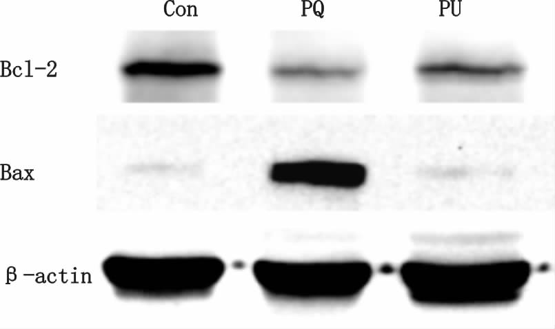 Western blot显示三组之间差异具有统计学意义(P<0.01):与Con组相比,PQ组Bcl-2/Bax蛋白含量表达明显降低差异有统计学意义[Bcl-2/Bax表达量(A值):(0.11±0.04) vs. (0.83±0.21)];与PQ组相比,PU组中Bcl-2/Bax蛋白含量表达增高差异有统计学意义[Bcl-2/Bax表达量(A值):(0.63±0.18) vs. (0.11±0.04)]。见图 4