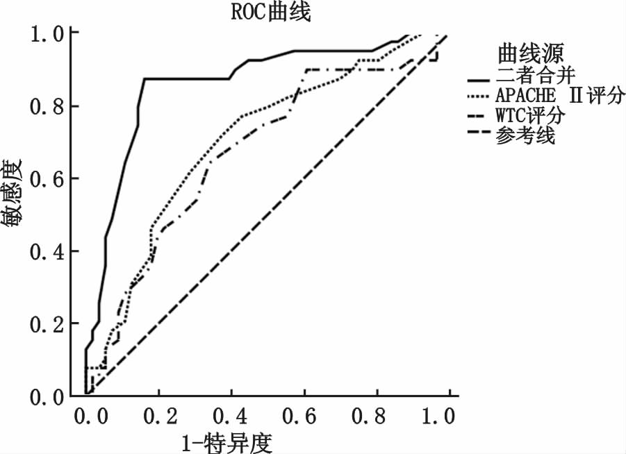 | 图 1 WIC评分、APACHEⅡ评分以及将二者联合对留观大于72 h预测ROC曲线分析 Fig. 1 ROC curve analysis,evaluation of the prognostic value of the WIC score,APACHEⅡscore,and their combination |
