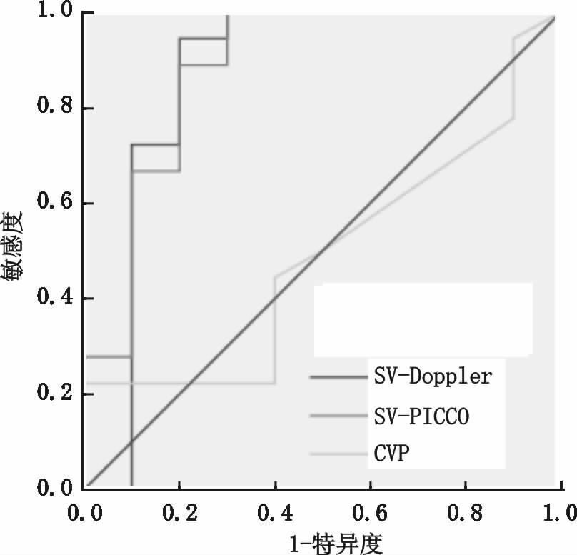 由于SV升高差值对PLR容量扩张预测有最高敏感度和特异度[8],对本研究的心脏多普勒超声和PICCO两种持续血流动力学监测方式的SV升高差值的预测能力进行了ROC曲线下面积比较并与CVP升高差值对照。数据显示心超和PICCO监测的PLR测试期间与基础的SV差值及CVP差值预测容量反应性ROC曲线下面积分别为0.867(心超监测SV差值,SV-Doppler),0.883(PICCO监测SV差值,SV-PICCO)和0.489 (中心静脉压差值,CVP),前两者的AUC差异无统计学意义,但均明显高于CVP升高值。提示动态的SV监测能够反映PLR的容量复苏预测价值,而CVP的升高水平不具有评估意义。其各自AUC和95%CI图 1